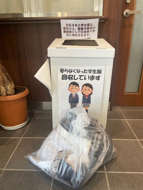 さいたま市及びその近隣のエリアに学生服の回収BOXを設置しています。卒業後にご不要となった学生服をお持ちください。回収した学生服で再利用可能なものは査定をしてその査定分を「日本赤十字社」に能登半島地震の義援金として寄付しております。現在この活動に賛同頂いた施設様は下記の一覧の通りです。お近くにございましたら是非ご利用ください。また随時BOXを設置頂ける施設様を募集しておりますので、ご理解いただければ幸いです。